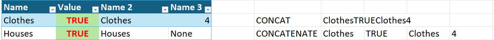 Note: the concat function does not yield the same result as the concatenate function in all circumstances. Here's just one example of a difference, I have seen at least one other instance where the CONCATE yielded a different result thatn the CONCATENATE, but I don't recall what that was,