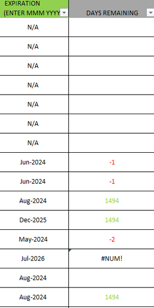 Good morning, I'm currently having an issue getting a formula to work. currently column i contains expirations formatted as MMM-YYYY. I need column J to show either months remaining as a positive o...