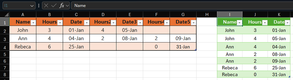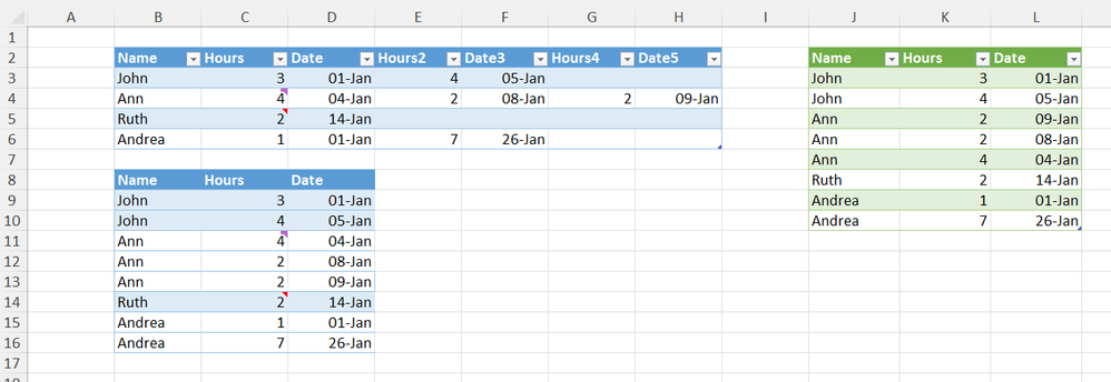 let Source = Excel.CurrentWorkbook(){[Name="Table"]}[Content], #"Added Custom" = Table.AddColumn(Source, "Custom", each { [Hours = [Hours], Date = [Date]], [Hours = [Hours2], Date = [Date3]], [Hours = [Hours4], Date = [Date5]] }), #"Removed Other Columns" = Table.SelectColumns(#"Added Custom",{"Name", "Custom"}), #"Expanded Custom" = Table.ExpandListColumn(#"Removed Other Columns", "Custom"), #"Expanded Custom1" = Table.ExpandRecordColumn(#"Expanded Custom", "Custom", {"Hours", "Date"}, {"Hours", "Date"}), #"Filtered Rows" = Table.SelectRows(#"Expanded Custom1", each [Hours] <> null), #"Changed Type" = Table.TransformColumnTypes(#"Filtered Rows",{{"Date", type date}, {"Hours", type number}, {"Name", type text}}) in #"Changed Type"Hope this helps.