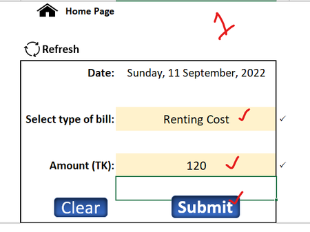 Sub Submit() If Range("C4").Value = "" Then Range("C4").Select MsgBox "Please enter the date!", vbExclamation Exit Sub End If If Range("C6").Value = "" Then Range("C").Select MsgBox "Please enter the type of bill!", vbExclamation Exit Sub End If If Range("C8").Value = "" Then Range("C8").Select MsgBox "Please enter the amount!", vbExclamation Exit Sub End If Worksheets("Home").Range("C4,C6,C8").Copy With Worksheets("Data Sheet").Range("A2") .PasteSpecial Paste:=xlPasteValuesAndNumberFormats .EntireRow.Insert End With Application.GoTo Worksheets("Home").Range("C6") Range("C6,C8").ClearContents End Sub