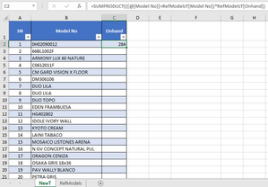 Hi Everyone! I have a stock sheet with all models which I have already and now want to get some spcific models stock in a new sheet,,, I use =SUMPRODUCT(([@[Model No]]=RefModelsT[Model No])*RefMode...