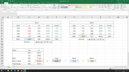 While this isn't exactly what I was thinking of, I've combined all of them in one sub and by dividing the total of mix a+b by the wanted value of mix a+b, and the value that comes from it times every red-text cell. This will get a roughly correct values