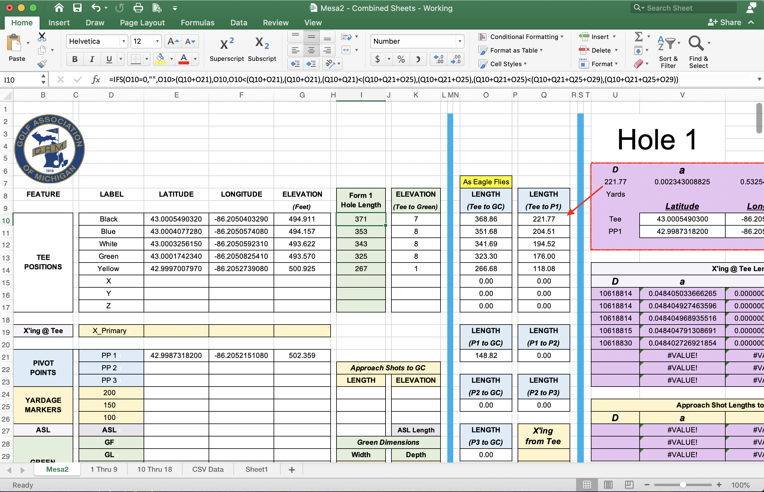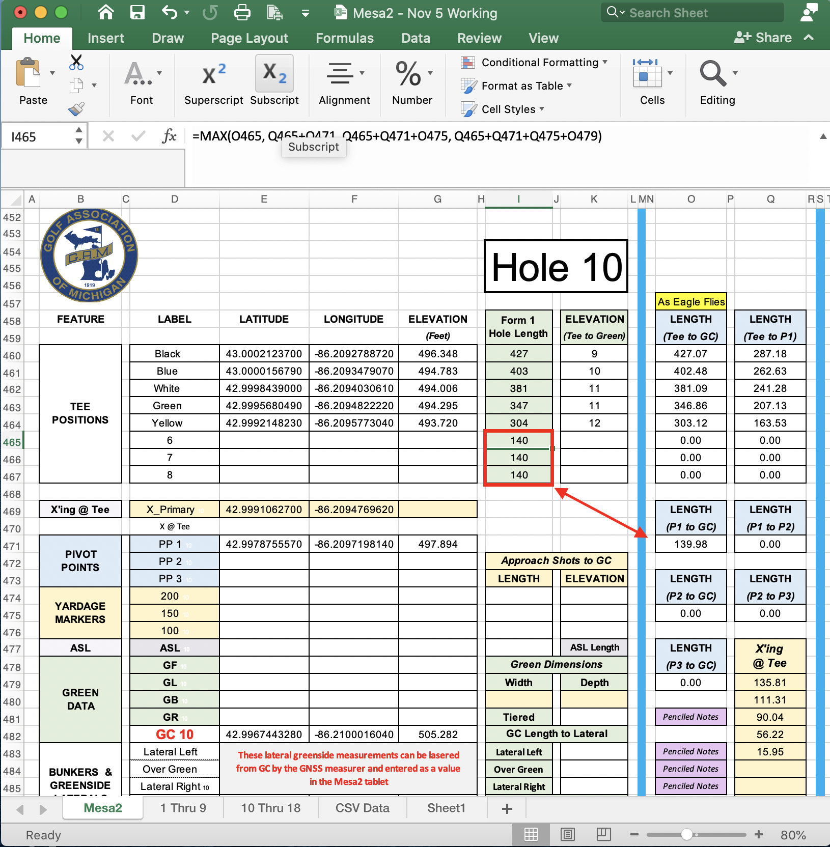 Our spreadsheet provides encountering up to 8 teeing grounds, although the normal scenario is between 3-5 teeing grounds. Both my attachments utilize 5 active teeing grounds (e.g. Black, Blue, White, Green, Yellow). Tees 6, 7 & 8 are inactive and need to depict a blank or at least a value of 0 so those at headquarters are not confused by the data collected in the field if they see a value (e.g. Hole 9's inactive 6, 7 & 8 are blank as they should be and Hole 10's inactive 6, 7 & 8 erroneously show 140 yards).