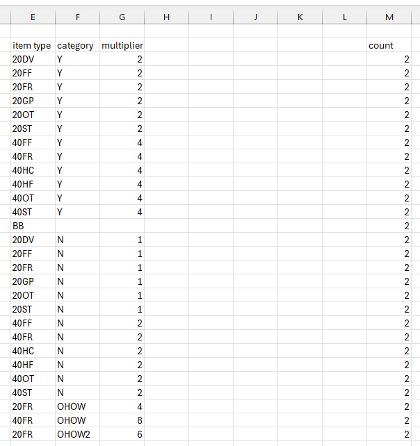 =IF(AND(E2="20DV", F2="Y"), M2*2, IF(AND(E2="40ST", F2="Y"), M2*4, ""))