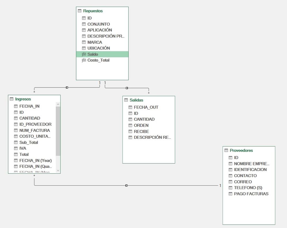 I have an archive with 3 tables to manage a warehouse. The tables are Parts_Table(Repuestos), IN_Table(Ingresos) and OUT_Table(Salidas). They are related in Power Pivot so I can have a Pivot Table of the actual quantity of products in the warehouse (Inventory).