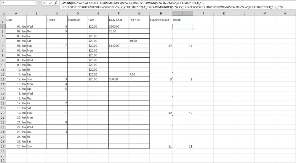 =IF(B2="Sun",IFERROR(SUM(INDEX($C$2:C2,LARGE(IF($B$2:B2="Mon",ROW($B$2:B2)-1),1)): INDEX($C$2:C2,LARGE(IF($B$2:B2="Sun",ROW($B$2:B2)-1),1))), SUM(INDEX($C$2:C2,1):INDEX($C$2:C2,LARGE(IF($B$2:B2="Sun",ROW($B$2:B2)-1),1)))),"")This formula works in my sample file in Excel 2013 and in modern Excel. The formula must be entered as an arrayformula with ctrl+shift+enter if someone doesn't work with Office 365 or Excel for the web or Excel 2024. The formula is in cell I2 and filled down.