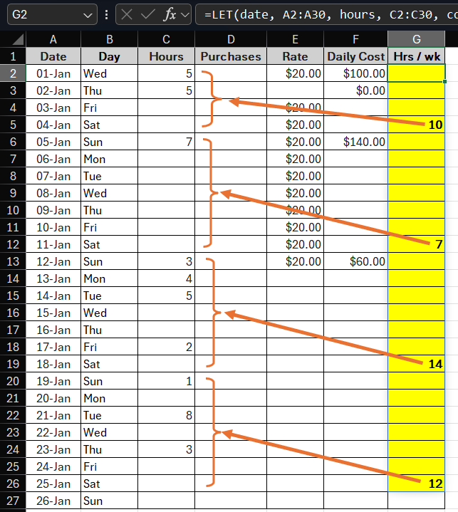 I am using the following formula to calculate weekly hours. I want to change it to calculate the hours with the starting on Monday going to Sunday and display the result in column G on the Sunday. For example - calculate totals from Monday Jan 6 to Sunday Jan 12, inclusive.
