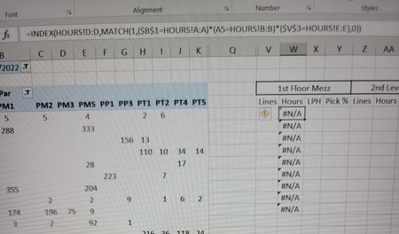 =INDEX(HOURS!$D:$D,MATCH(1,(HOURS!$A:$A=$B$1)*(HOURS!$B:$B=A5)*(HOURS!$E:$E=$V$3),0))This formula works in the attached file.