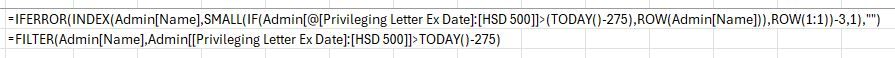 =FILTER(Admin[Name],Admin[[Privileging Letter Ex Date]:[HSD 500]]>TODAY()-275)