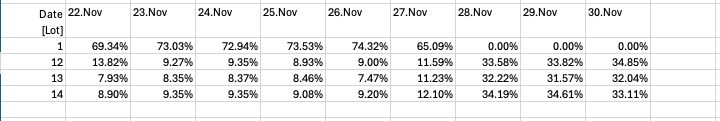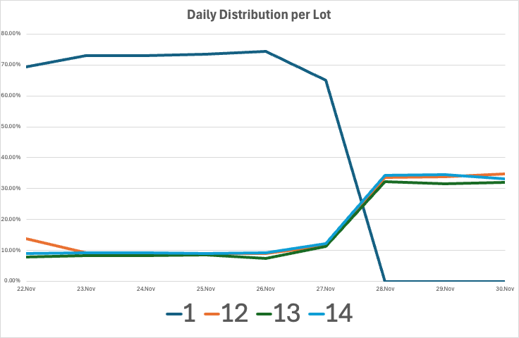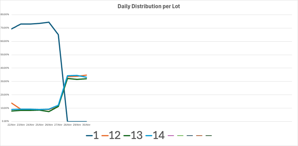 What I'm trying to achieve is to get the data graphed to show the Ratio of Solar Delivered per day per Lot. Something like this, which is fine for Phase 1 for the month of November only: