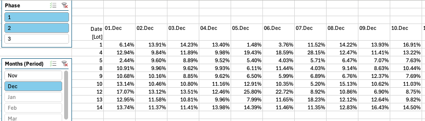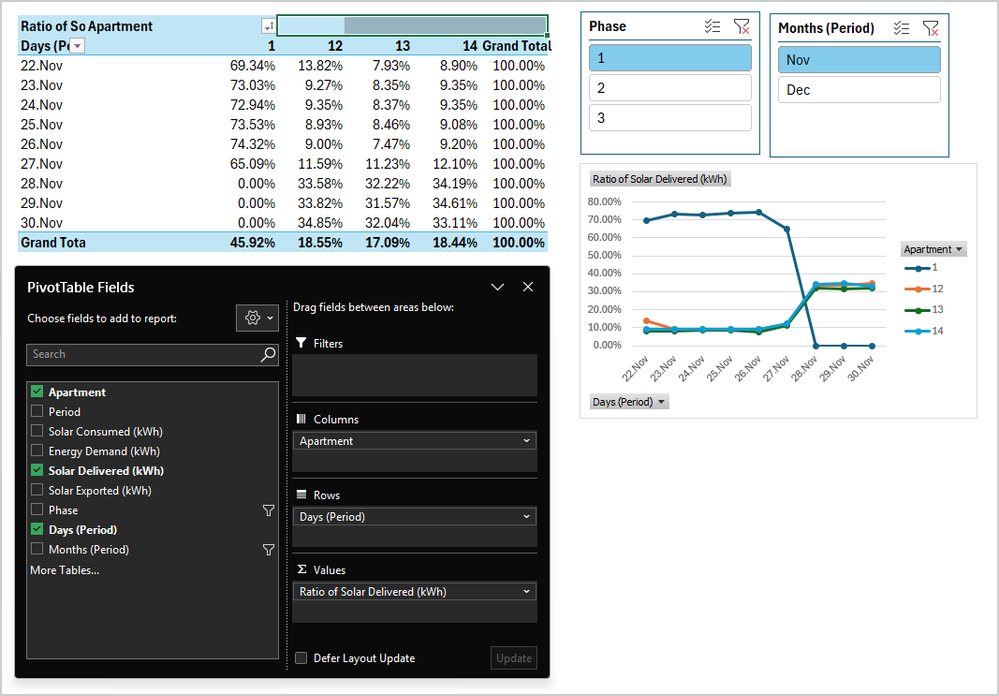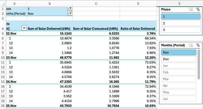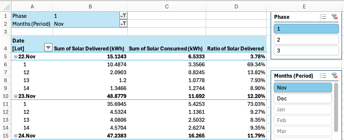 I've added slicers to the resulting pivot so I can look at each month of data for each phase. [Note that the system went into operation on Nov 22, so the November data is only a few days, beginning Nov 22]