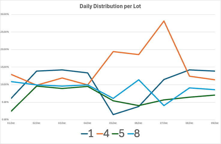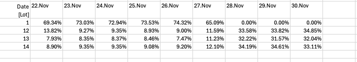 the graph stays stuck on showing just the first four lots and the first 9 days because that was the size of the table when I grated the graph.