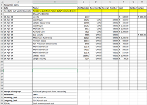 I do work with various formulas on other sheets that we use in the document. I am currently looking for some advice on creating and setting up this sheet for our company's Reception with regards to receipting and petty cash.