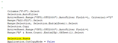 Sub Sample() Dim LastRow As Long LastRow = Range("A" & Rows.Count).End(xlUp).Row Range("F1:F" & LastRow).AutoFilter Field:=1, Criteria1:="2" Range("A2:F" & LastRow).Copy Destination:=Range("A" & LastRow + 1) Range("F1:F" & LastRow).AutoFilter Field:=1 End Sub