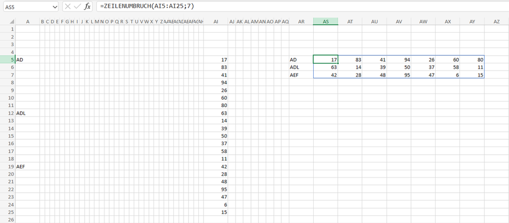 =WRAPROWS(AI5:AI25,7)