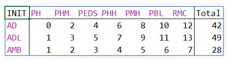 = LET( facl, TAKE(WRAPROWS(facility,7), 1), init, TAKE(WRAPROWS(initials,7),,1), ftot, WRAPROWS(totals,7), gtot, BYROW(ftot, LAMBDA(x,SUM(x))), hdr, HSTACK("INIT", facl, "Total"), body, HSTACK(init, ftot, gtot), VSTACK(hdr, body) )Had you required it, it wouldn't have taken much to calculate the facility totals from the daily totals within the formula.