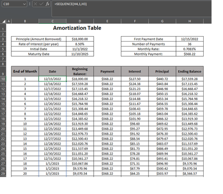 In attempting to create an Amortization Table, I'm having trouble filling out my Date column using the Sequence formula. I want the first date (Cell C10) to show the 15th day of the month following t...
