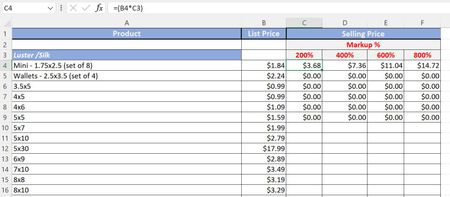 Hello, I am not very experienced in Excel but I am trying to make a spreadsheet that allows me to have the base cost of an item and multiply it by a set of specific % of markup to find the total pric...
