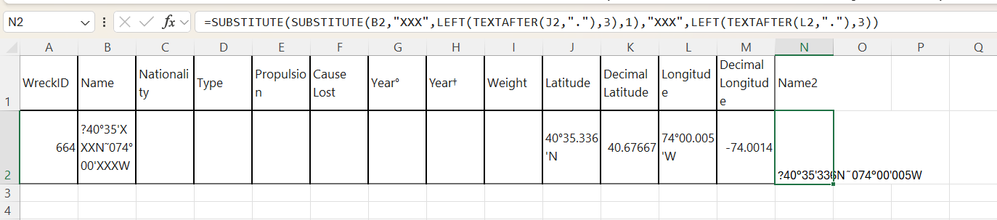 =SUBSTITUTE(SUBSTITUTE(B2,"XXX",LEFT(TEXTAFTER(J2,"."),3),1),"XXX",LEFT(TEXTAFTER(L2,"."),3))I know you only asked for the Longitude one but just in case you needed both I did both figuring you could delete the part you don't need. If you really don't want that Name2 column then you can do it, copy the column and then Paste Values Only overtop the Column B values.