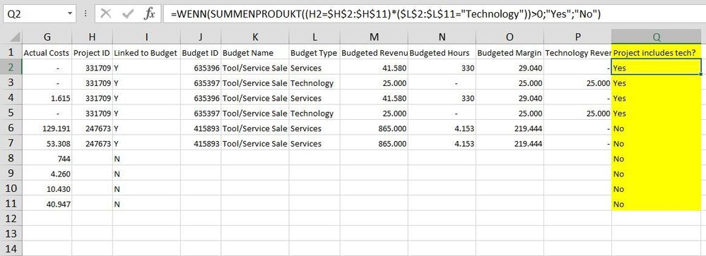 The question I am trying to solve for is: for projects that are linked to budgets - if a project contains the sale of technology, how can I tag all the associated project lines (technology + services) as "Y" for "project includes tech (col Q; highlighted yellow)?".