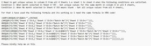 Sub GetUniqueValues() Dim ws6 As Worksheet Dim ws1 As Worksheet, ws2 As Worksheet, ws3 As Worksheet, ws4 As Worksheet Dim rng1 As Range, rng2 As Range, rng3 As Range, rng4 As Range Dim filterValue As Variant Dim result As Variant Dim i As Long, j As Long ' Set the worksheet references Set ws6 = ThisWorkbook.Worksheets("Sheet6") Set ws1 = ThisWorkbook.Worksheets("Sheet1") Set ws2 = ThisWorkbook.Worksheets("Sheet2") Set ws3 = ThisWorkbook.Worksheets("Sheet3") Set ws4 = ThisWorkbook.Worksheets("Sheet4") ' Get the filter value from Sheet6 B3 filterValue = ws6.Range("B3").Value ' Set the ranges based on the filter value If filterValue <> "" Then Set rng1 = ws1.Range("A:D").SpecialCells(xlCellTypeConstants) Set rng2 = ws2.Range("A:D").SpecialCells(xlCellTypeConstants) Set rng3 = ws3.Range("A:D").SpecialCells(xlCellTypeConstants) Set rng4 = ws4.Range("A:D").SpecialCells(xlCellTypeConstants) Else Set rng1 = ws1.Range("D:D").SpecialCells(xlCellTypeConstants) Set rng2 = ws2.Range("D:D").SpecialCells(xlCellTypeConstants) Set rng3 = ws3.Range("D:D").SpecialCells(xlCellTypeConstants) Set rng4 = ws4.Range("D:D").SpecialCells(xlCellTypeConstants) End If ' Combine the ranges and get unique values result = Application.WorksheetFunction.Unique(Application.WorksheetFunction.VStack(rng1, rng2, rng3, rng4)) ' Sort the unique values result = Application.WorksheetFunction.Sort(result, 1) ' Clear existing data in Sheet6 column A ws6.Range("A:A").ClearContents ' Write the unique values to Sheet6 column A For i = 1 To UBound(result, 1) ws6.Cells(i, 1).Value = result(i, 1) Next i End SubThis code should work (untested) as long as you have Excel 365 or a version of Excel that supports dynamic arrays and the VStack and Unique functions. If you have an older version of Excel, you may need to use a different approach.