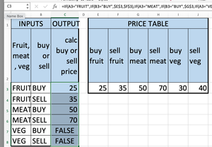 I have 3 inputs that may be entered in A3 (Fruit, meat, or veg) and 2 inputs (buy or sell) that may be entered in cell B3. I generated a reference table of pricing for the 6 different combinations of...