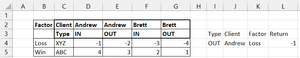 Hi,     Please can someone help me amend my formula to include the type to be IN/OUT.  E.g. Factor = Loss, Client = Andrew, Type = OUT would return -2 as my current formula:  =XLOOKUP(K4,B3:B5,XLOOKU...