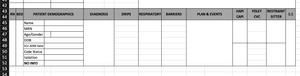 Thanks for reading and reaching out to attempt to help me! Sorry if I wasn't clear. Maybe this new screenshot will help. I created a blank worksheet that we will fill in with patient data. I have created some cells that have drop down boxes with choices to input data (trying to decrease keystrokes and standardize data). Other cells I have CountIf formulas to tally certain responses that will be on the very first page of this document. The remaining cells will be free text input. I learned how to have my column titles ( lack of the right terminology ) to be repeated at the top of every page. So I am not worried about that row.