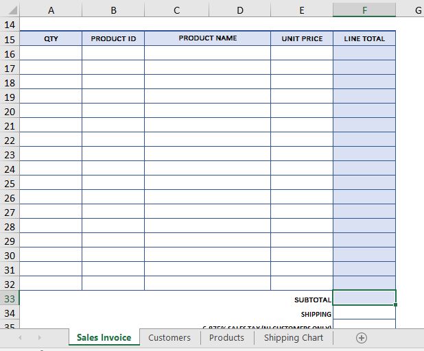 Hey, I'm new to Excel and I'm still trying to figure out some of the formulas, so I uploaded a couple images of my workbook how I have it set up now. What I really need help with is formulas in my "Sales Invoice" sheet. I'm trying to set this up so that after I input a Product ID and a Quantity, Excel will return the Product Name and the Unit Price from my "Products" sheet in the appropriate cells of my "Sales Invoice" sheet. I've been trying to use LOOKUP, VLOOKUP, and MATCH functions to accomplish this, but I can't seem to get it right. Any help would be greatly appreciated!