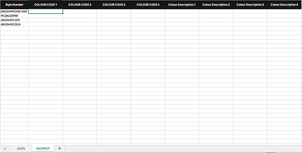 Some style numbers have multiple colour options but I need these to run in rows rather than down columns.. What's the easiest way to do this? Some sort of INDEX/XMATCH?