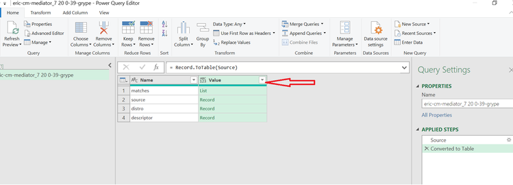 Once I have imported the json file into excel, the Power BI editor is opened and it's converted to queries.