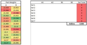 Hello! My problem is relatively simple, but I can't find a way to make it. I have 14 parts of type A and 14 parts of type B and their weights. I need to group they in 7 sets containing 2 of each (e...