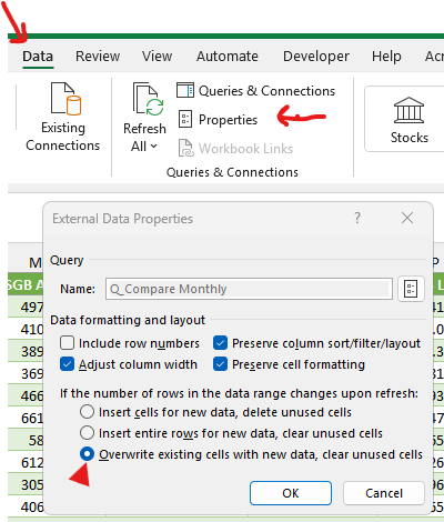 Thanks for posting Mohami. I am not finding the overwrite option in Data->Queries & Connections->Properties. Could you show me where you are seeing it. Thanks Jacchi