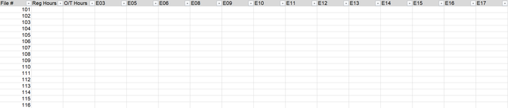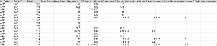 I'm having a problem with a new report where I'm trying to pair payroll codes with their number of hours per personnel number. The regular and overtime hours are always in the same columns, so no problem there, but the others extra codes appears one after the other on the same row associated with the personnel number and it's not always the same.