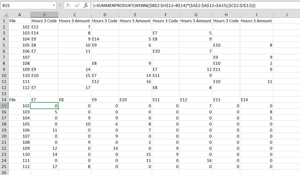 =SUMPRODUCT(IF(($B$2:$H$12=B$14)*($A$2:$A$12=$A15),$C$2:$I$12))
