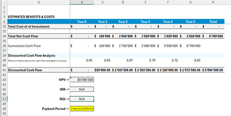 Metric Value Formula Used NPV ₦1,192,950 =SUMPRODUCT(C4:G4, C5:G5) + B4 IRR 41% =IRR(B4:G4) ROI 126.67% =(SUM(C4:G4) + B4) / ABS(B4) Payback Period 1 Year and 10 Months See LET formula above I have also added: