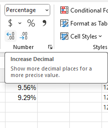 step 3: click on the increase decimal places button (the one on the right in the image above with the arrow pointing right)