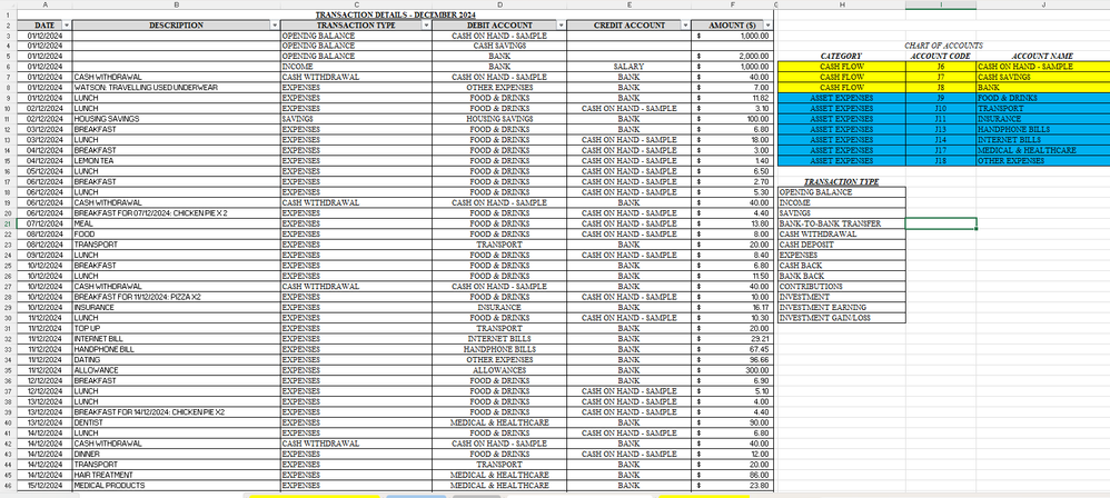Debit: =IF('TRANSACTION DETAILS - SAMPLE'!D14='TRANSACTION DETAILS - SAMPLE'!$J$6,'TRANSACTION DETAILS - SAMPLE'!F14,"")