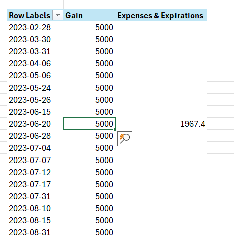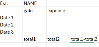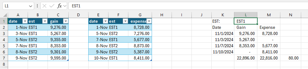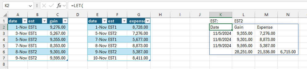 =LET( header,{"Date","Gain","Expense"}, dateCol,SORT( UNIQUE( VSTACK( FILTER(Table1[date], Table1[est]=L1, ""), FILTER(Table2[date], Table2[est]=L1, "") ) ) ), gainCol,IFERROR(VLOOKUP(dateCol,Table1,3,FALSE),0), totalGain,SUM(gainCol), expenseCol,IFERROR(VLOOKUP(dateCol,Table2,3,FALSE),0), totalExpense,SUM(expenseCol), gainexpense, (totalGain-totalExpense), totalrow, HSTACK("",totalGain,totalExpense,gainexpense), combinedData,HSTACK(dateCol,gainCol,expenseCol), IFERROR(VSTACK(header,combinedData,totalrow),"") )