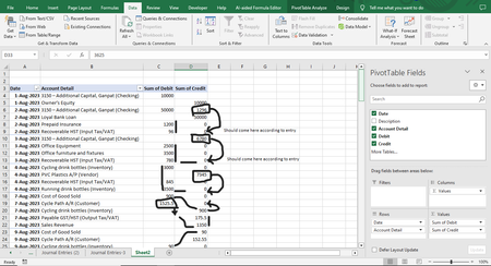 I have created a Journal entries sheet in Excel which have one month sample transactions entered in it now I am trying to create Ledger from that sheet using Pivot table but problem occurs that the D...