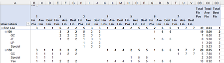 Hello, I'm trying to create a pivot table that has multiple total columns. I can get the totals, but it adds a column for Average and MIN (Best finish) to each FIN (finishing position) in the b...