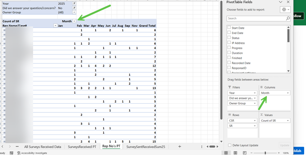I verified that the pivot table was set to view all months, which it is (there is data going back to Jan of 2024.).