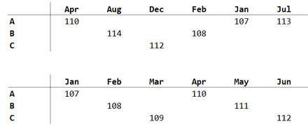 = LET( serial, DATEVALUE(1&month), PIVOTBY(product, serial, quantity, AVERAGE,,0,,0) )I would consider the second crosstab to be an improvement. If you do not have an obvious way of sorting, simply list the categories in order and use XMATCH to return an index.