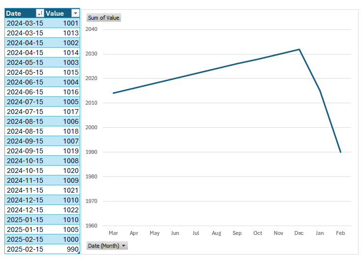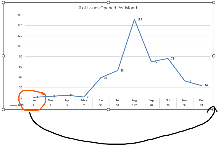 I'm currently tracking # of monthly issues submitted in line graph (per below attachment). Now that new year has started, any issues opened in Jan. '25 are appearing at beginning of graph instead of end. I need data to reflect Mar - Dec '24, with next month reflecting Jan. '25 following Dec. The source column is formatted as DD/MM/YYYY. How can i reflect this data in chronological order?