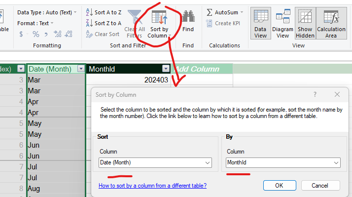 MonthId = Table1[Date (Year)]*100 + Table1[Date (Month Index)]after that select Date (Month) column and Sort By column MonthId