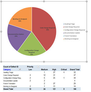 You might create a pivot table without Priority in the Columns area (i.e. only Category in the Rows area and Defect ID in the Values area), then create a pie chart from that pivot table.