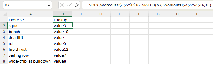 =INDEX(Workouts!$F$5:$F$16, MATCH(A2, Workouts!$A$5:$A$16, 0))