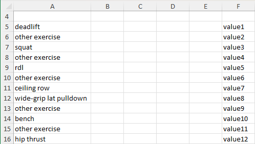 So I'd have to create a MATCH and INDEX Formula for each of the 7 key exercises (squats, bench, deadlift, rdl, hip thrust, ceiling row, wide-grip lat pulldown). And they would all have to be under Column A because that's where the exercises will appear. But am I able to create 7 versions of the same formula for 7 different exercises, all under the same column (column A)?