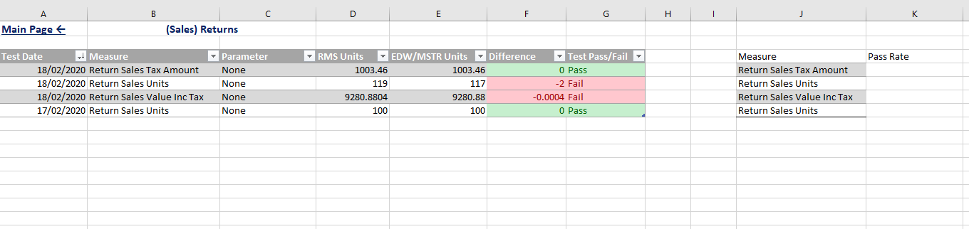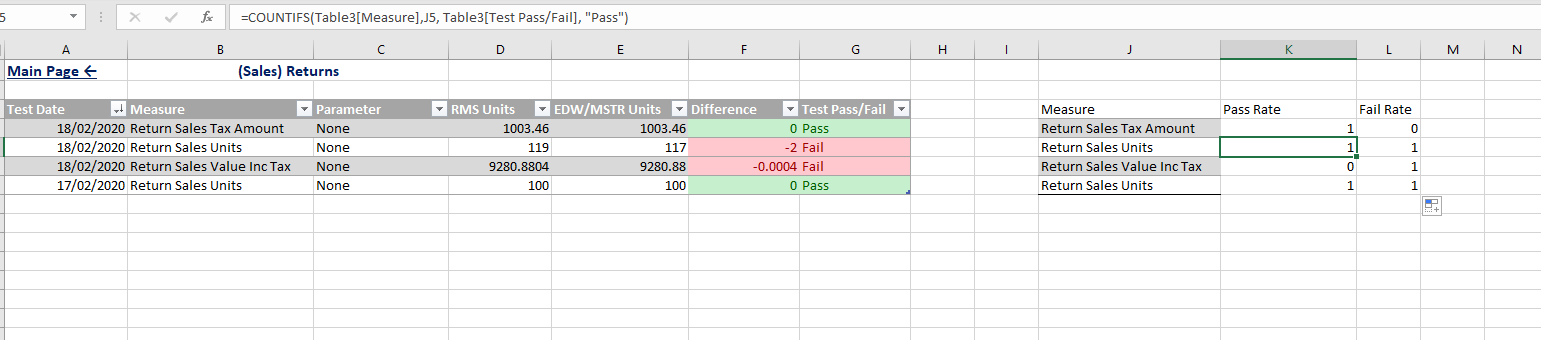 Hi there,     I want to count in column K the number of "Pass" in 'Test Pass/Fail' column of the left table. (See image).     I want to find the pass count for each individual measure and have them a...