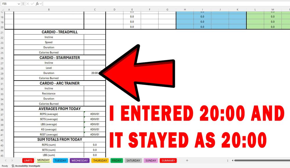 PLEASE HELP ME!!! I created an excel workbook for tracking fitness workouts, I record the data such as weight lifted, number of reps, and rest times between sets. I formatted the cells so they express your rest times in terms of minutes and seconds (I used the custom "H:MM" format of time option). But whenever I record the amount of time you spend during cardio exercise, the formatting gets COMPLETELY SCREWED UP because when I type 28:44 (28 minutes and 44 seconds) of cardio duration, it instantly turns into 4:44 (4 minutes and 44 seconds). But if I type 20:00 (20 minutes) of cardio duration, it stays as 20:00 (20 minutes) and it never turns into something else. Why do some of the numbers like 28:44 transform into a complete different number when I enter them? I uploaded 3 screenshots below to better express what I mean.